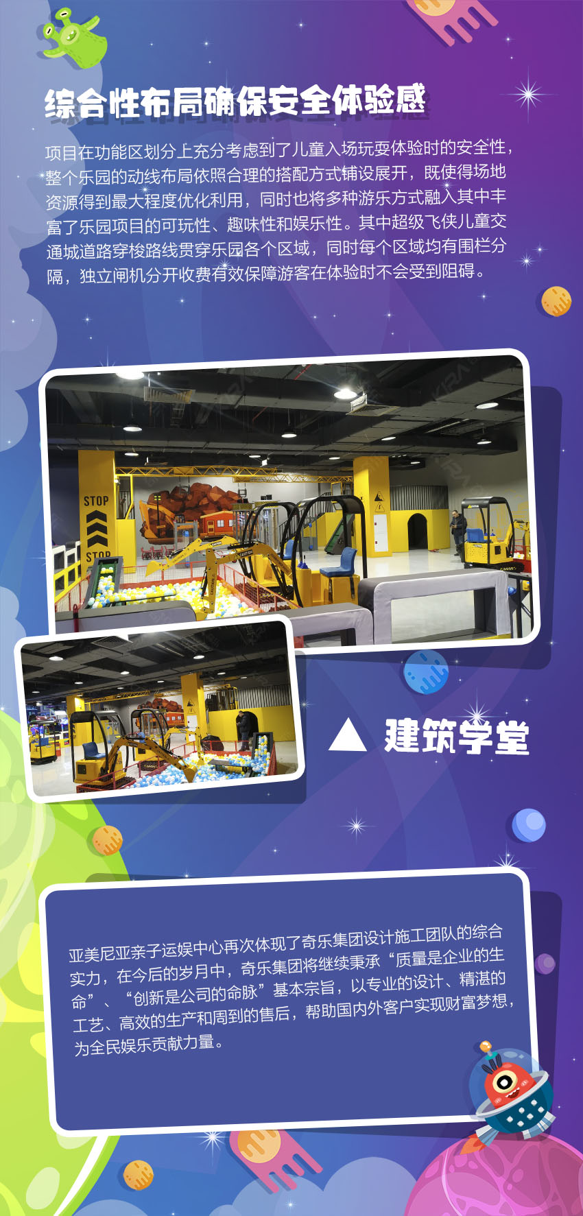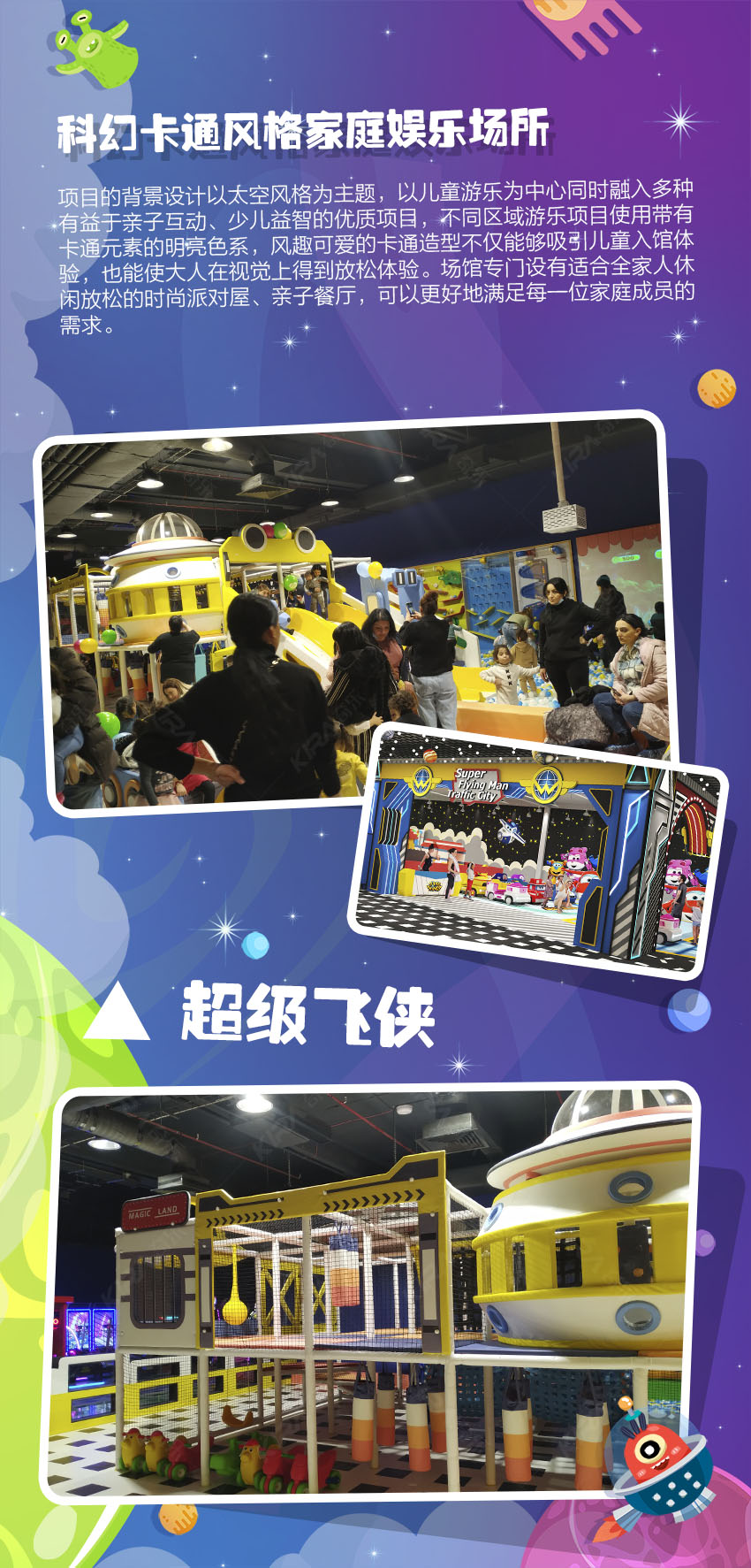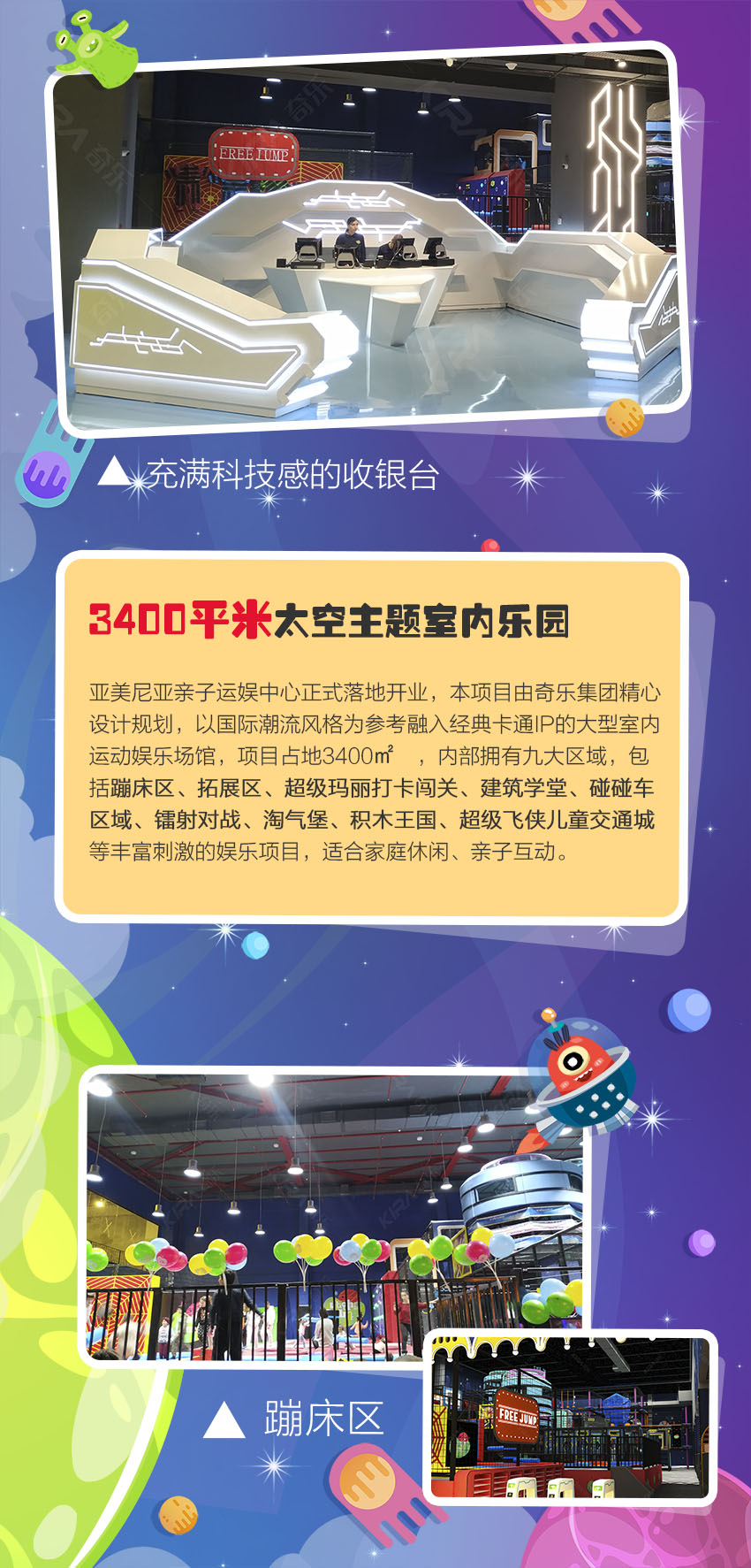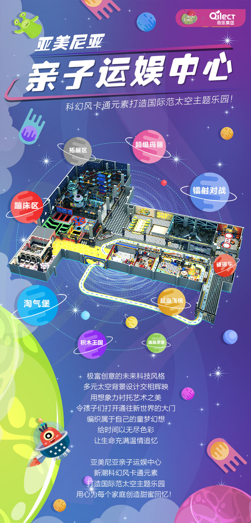 極富創意的未來科技風格,多元太空背景設計交相輝映。用想象力襯托藝術之美,令孩子們打開通往新世界的大門,編織屬于自己的童夢幻想。給時間以無盡色彩,讓生命充滿溫情追憶! 亞美尼亞親子運娛中心,新潮科幻風卡通元素,打造國際范太空主題樂園,用心為每個家庭創造甜蜜回憶!