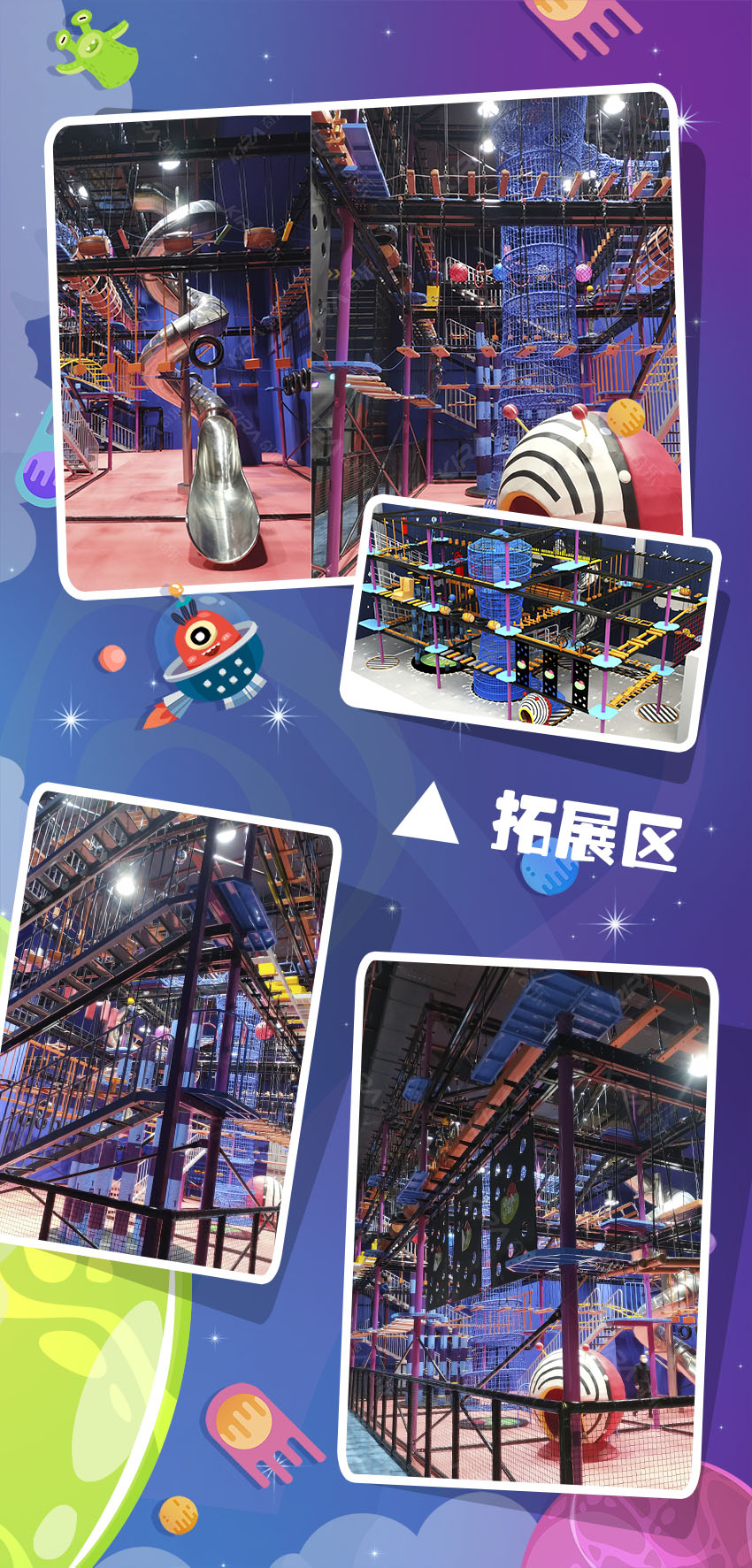 奇樂游樂是游樂設備實力廠家,美國 Galaxy Multi Rides是奇樂在美國做的忍者道拓展項目,是一個在戶外搭建起來的拓展項目,室內大人,青少年挑戰,游玩的項目。本忍者道拓展有攀巖墻,空中攀爬挑戰關卡都能多種拓展項目,是由奇樂優秀的設計師團隊設計出來的方案,忍者道拓展項目在國外是非常流行的一種項目之一,它是可以鍛煉游玩者的體能,需要有優秀的身體素質,也能鍛煉游玩者的身體。