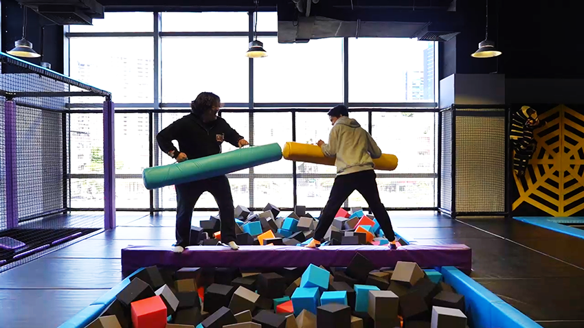 在獨木橋上對壘,掌握技巧和平衡,把對手推到海綿池中,獲得勝利。