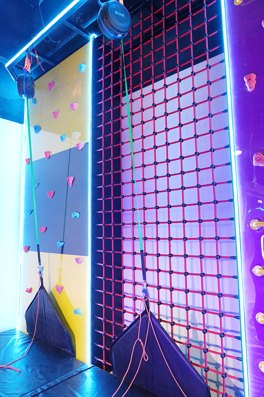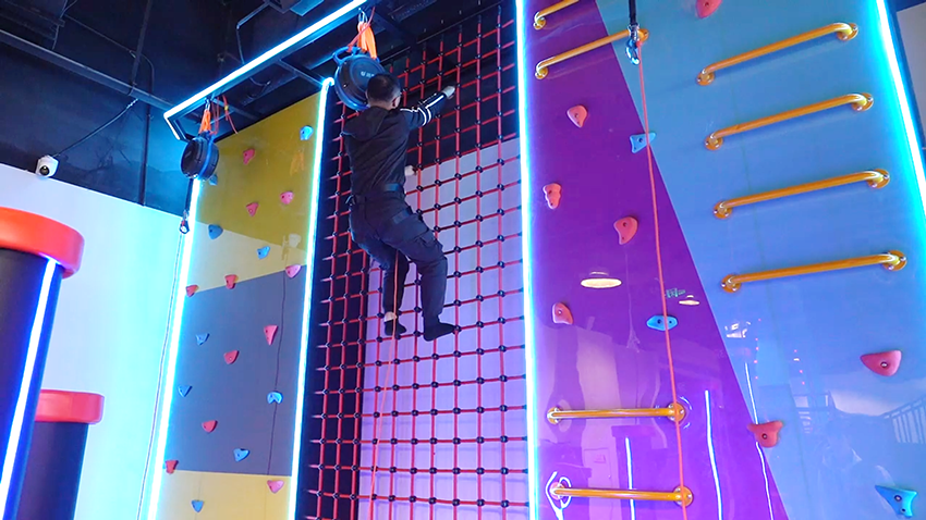 特制的衣服,通過蹦床的彈力,可以粘貼在覆蓋有魔術貼的墻壁上,從而實現“飛檐走壁”的體驗效果。
