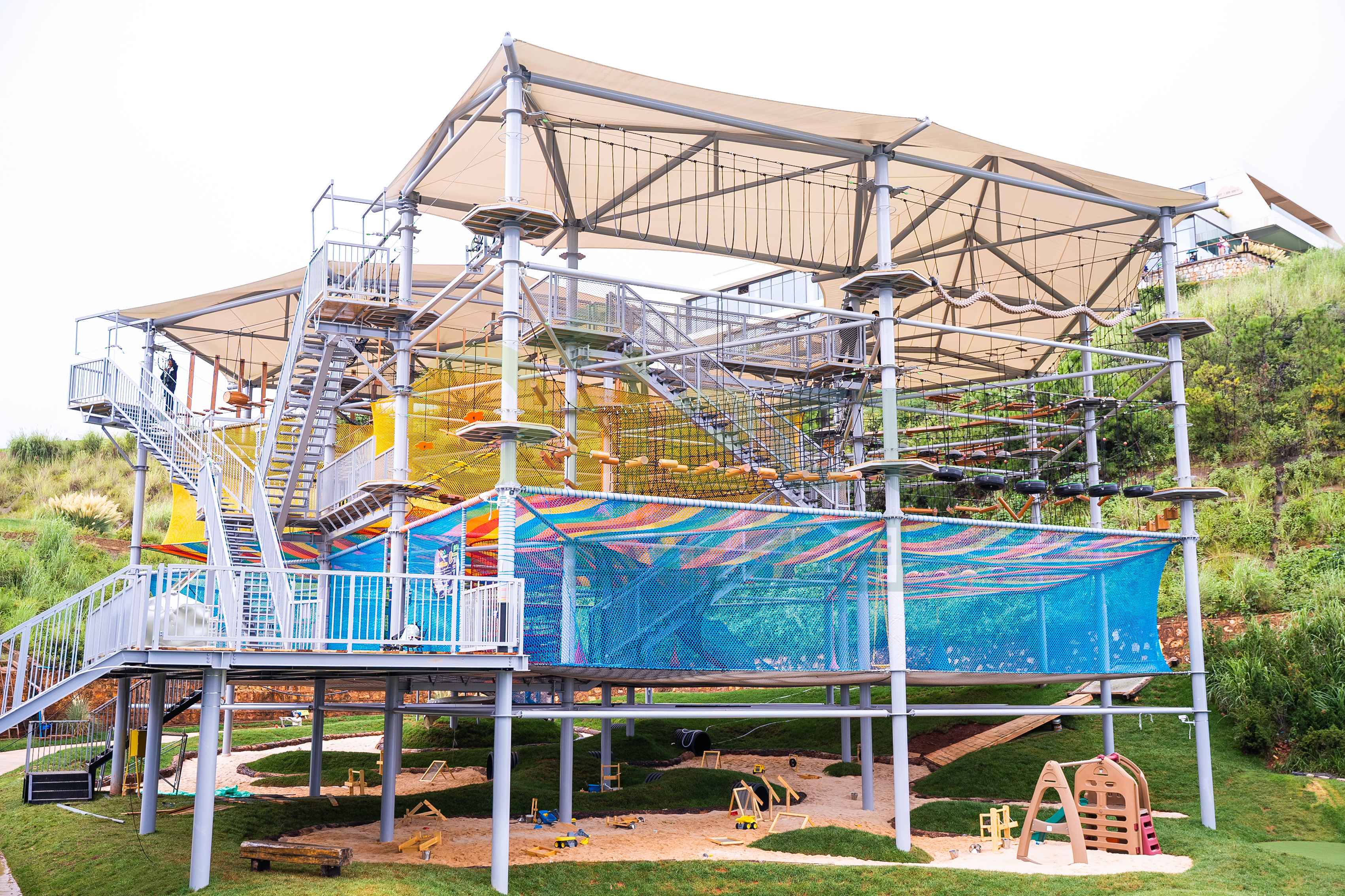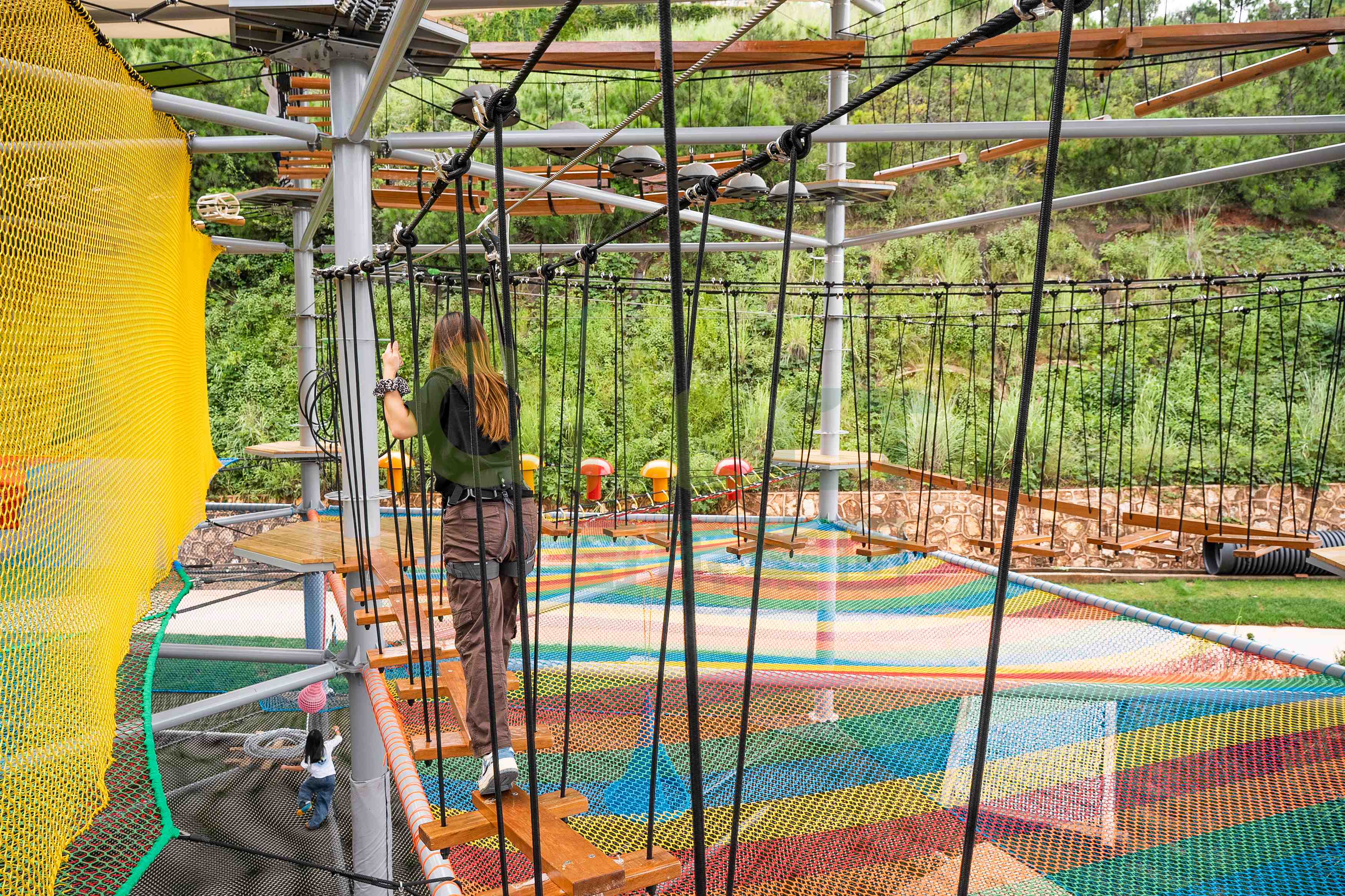 一座大型水晶塔的空中步道總長可達(dá)數(shù)百米,包含百余種趣味關(guān)卡,能夠同時容納上百名游客進(jìn)行探險。更重要的是,通過科學(xué)的分層路線規(guī)劃,它能覆蓋從4歲兒童到成年人的全年齡段客群。孩子們可以在低齡區(qū)鍛煉勇氣,青少年和成人則可以挑戰(zhàn)更具難度的攀爬網(wǎng)、高空步道以及令人腎上腺素飆升的頂層速降項目。這種家庭全員可參與的特性,是其能引爆社交傳播和家庭出游市場的關(guān)鍵。