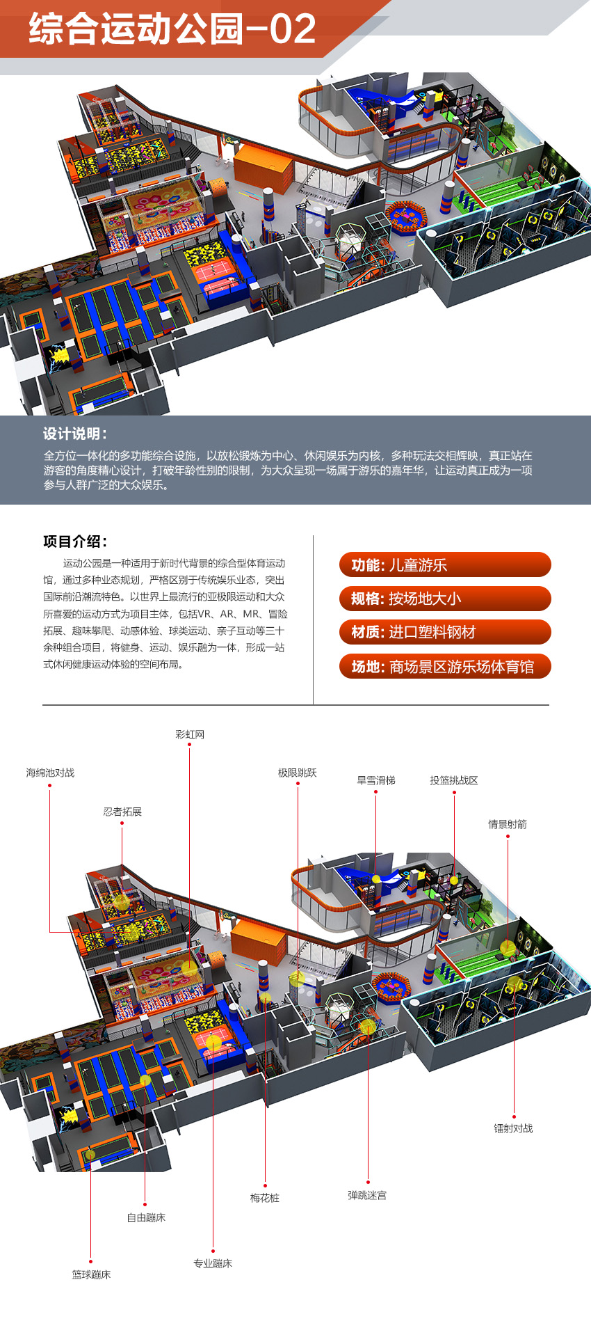 本項目適用于各種親子主題類的樂園,巧妙運用“熊貓”IP造型設計,集拓展、探險、滑道、飛索、蹦極、不銹鋼滑梯、攀巖、爬網等46種不同運動體驗的文化主題項目,結合“大灰熊”IP形象,融入相關設計元素,打造差異化的網紅IP主題性運動拓展營地綜合體。 在裝飾設計上采用竹葉和竹竿的綠色設計元素,以原生態、自然風格為基調,采用原木、繩網和不銹鋼等柔韌度好的生態材料。滿足大眾貼近自然、主題鮮明、寓教于樂的兒童素質訓練教育親子樂園的精神訴求。