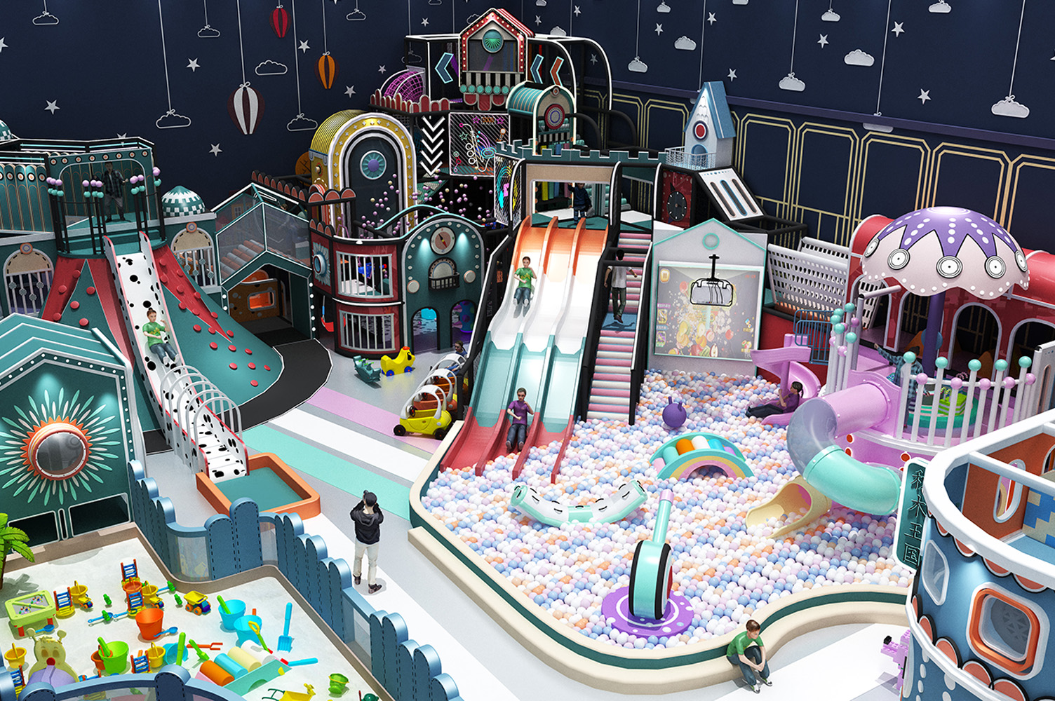 項目主色調以鐵綠色為主,場地空間布局層次分明、造型新穎規劃合理。以茉莉配色為設計理念,支持馬卡龍系列定制。內部游樂項目配置豐富齊全,包括滑滑梯、球池、椰子樹、彈跳迷宮、沙池、小蹦床等項目,造型設計活潑可愛充滿卡通風格,外觀色彩五彩繽紛能夠令孩子產生親切感,項目娛樂性互動性較強,清新而又舒適的游玩環境,能夠使孩子在玩樂中喚醒對美的渴望。