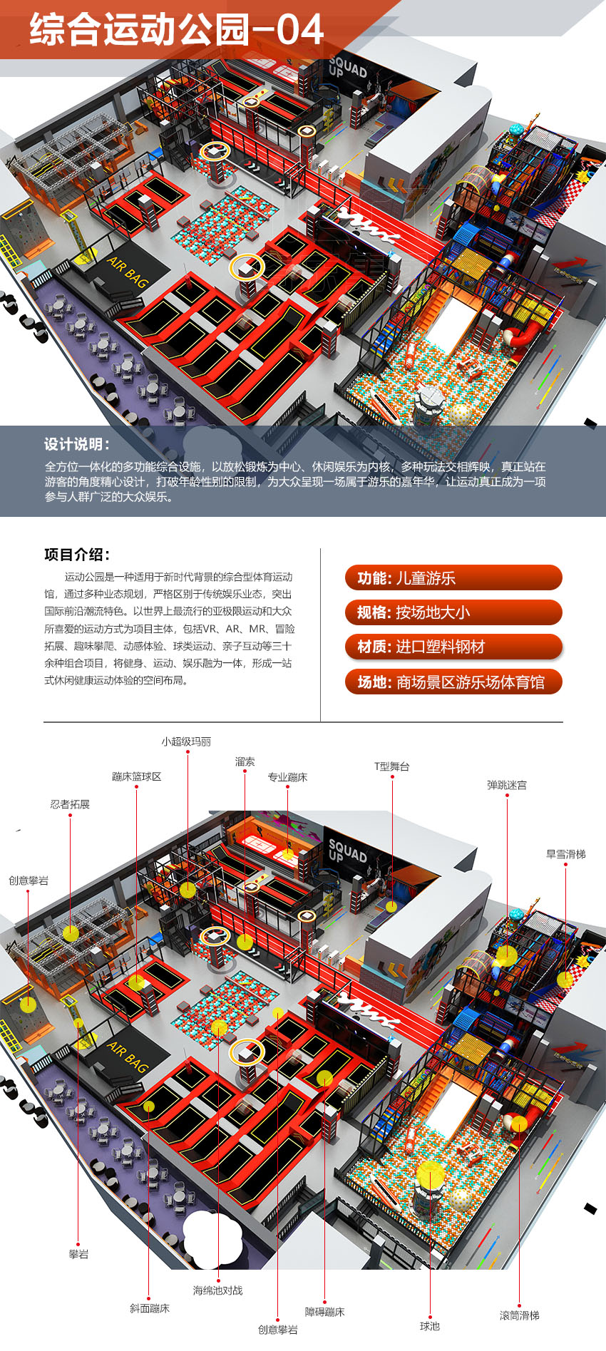 本項目適用于各種親子主題類的樂園,巧妙運用“熊貓”IP造型設計,集拓展、探險、滑道、飛索、蹦極、不銹鋼滑梯、攀巖、爬網等46種不同運動體驗的文化主題項目,結合“大灰熊”IP形象,融入相關設計元素,打造差異化的網紅IP主題性運動拓展營地綜合體。 在裝飾設計上采用竹葉和竹竿的綠色設計元素,以原生態、自然風格為基調,采用原木、繩網和不銹鋼等柔韌度好的生態材料。滿足大眾貼近自然、主題鮮明、寓教于樂的兒童素質訓練教育親子樂園的精神訴求。