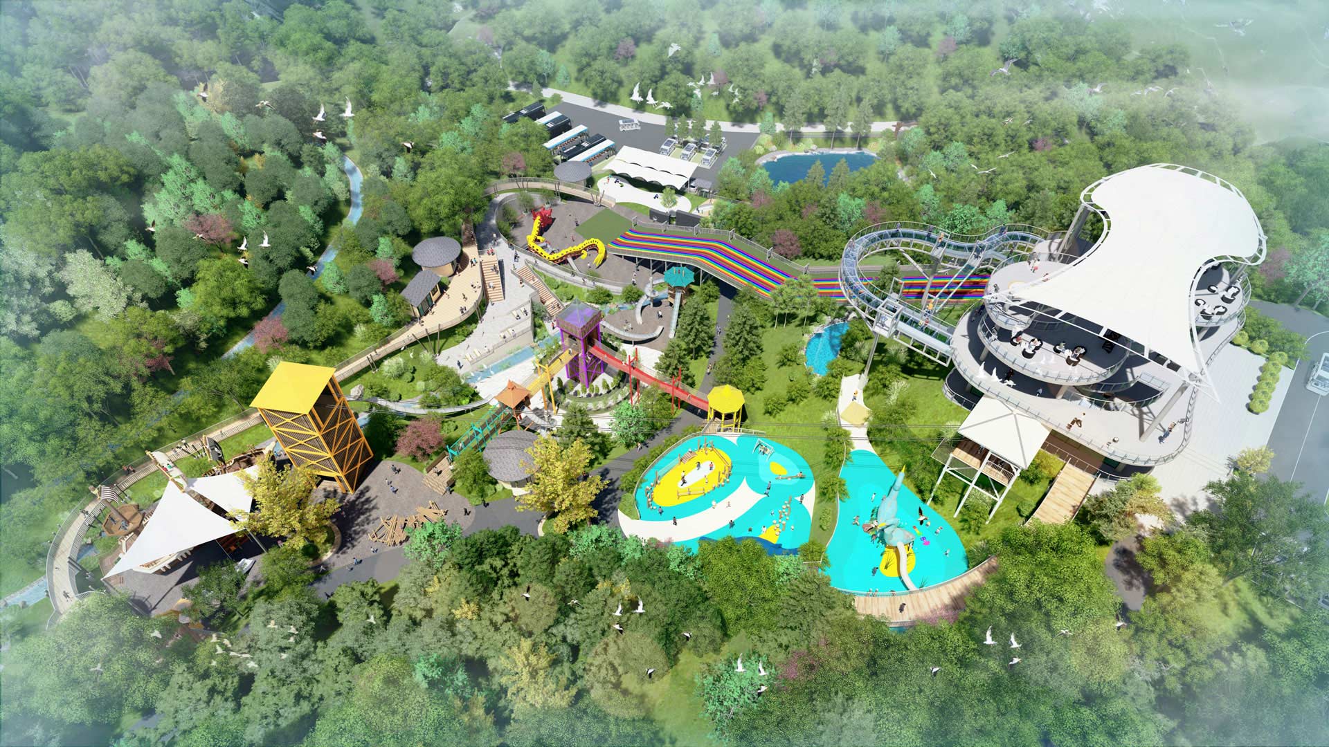 通過創(chuàng)建各種高架景觀和其他可下沉空間,改變原本凌亂的地貌,改造山谷、草坪、湖泊和濕地戲水池。在某些地區(qū)優(yōu)化地形,挖掘水面并重新引入廣泛的本地生態(tài)。 結合當地文化特色,融入孔子儒家思想、寓教于樂的傳統(tǒng)文化,以龍、鳥、魚等為設計元素,打造當下文化色彩濃郁的集旅游、觀光、研學、拓展、親子互動于一體的綜合型文化旅游景區(qū)。 為強調景區(qū)自然生態(tài),引入濕地、草地、溪流和干旱地段,激發(fā)與自然不同類型的互動,將景觀整體與周圍區(qū)域聯(lián)系起來。讓景區(qū)的設計保留盡可能多的現(xiàn)有樹木,除了耕種自然景觀外,設標志塔將場地統(tǒng)一成一個凝聚的整體,從而便利了出入和流通。